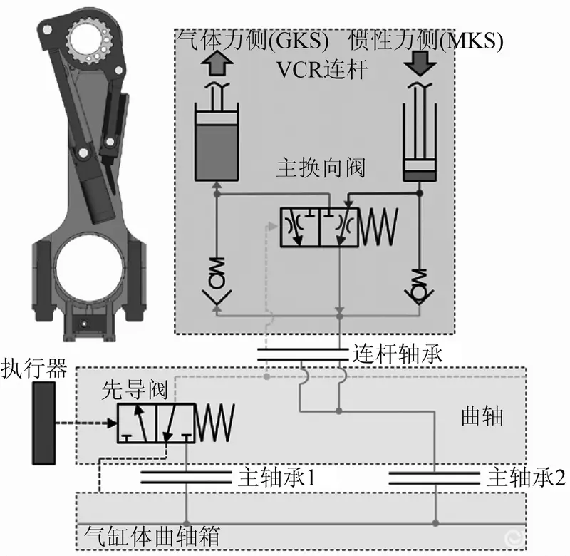 图2示出了配备有独立分离式控制油压管道的液压操纵系统的结构。先导阀位于曲轴前端旋转轴中心第1曲柄臂侧,通过电磁执行器来操纵。操纵力由穿过中心螺栓的压杆进行传递。控制油压从先导阀出发,经过孔和管道直至最终传递到连杆轴颈。每个连杆轴承的液压系统都是独立的,由相邻的主轴承额外供应机油。研究人员在每个连杆轴颈的3个平面上均设置了输出孔:在第1个平面上90 °交叉处布置了2个输出孔,用于传递控制油压;在位于轴颈中间的第2个平面上,径向布置了2个输出孔,用于润滑轴承;在第3个平面上90 °交叉处布置了2个输出孔,用于为VCR液压系统传输机油。另外,研究人员还在连杆轴瓦上分段加工了出油槽,该油槽对称于轴瓦剖分面伸展略大于90 °,这样就能实现主轴承与连杆之间永久性的机油传输。采用这种油槽设计的具体方案的优点是不会削弱轴承的主要承载区域。主换向阀由1个带有控制边缘的弹簧加载滑阀组成,在受非控制油压作用的情况下,VCR连杆的GKS支撑油腔出口管道关闭,MKS支撑油腔打开,意味着主换向阀在接通位置时,系统会以εHigh运行。